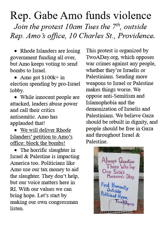 On Saturday 11am-12noon, East Bay Citizens for Peace is holding a vigil in Bristol on Hope St in front of the Bristol Post Office (“We Who Believe in Freedom Cannot Rest! No $ for War Crimes! No Genocide in our names!”)
